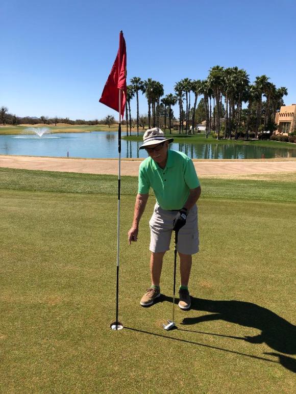 Congratulations to fellow QCMGA member Tom England for scoring a Hole In One on Friday April 2, 2021. Way to go Tom!!! Quoting him, “I got my Hole In One last Friday (April 2nd) on Quail 2 and it was a red flag. The distance was 149 yards, and I hit a 5 hybrid. My playing partners were John Dill and Terry Martin. The photo was taken by John Dill”.