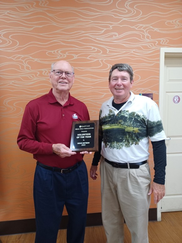 QCMGA member Doug Detman (left) received the award plaque from QCMGA President Bill Sheppard (right) after being named QCMGA 2022 Volunteer of the Year during the QCMGA 2022 Annual Meeting held on Tuesday November 15th. Doug joined QCMGA in 2015 and since then he has been actively supporting QCMGA and the Quail Creek golfing community in multiple ways. His list of volunteer activities include: