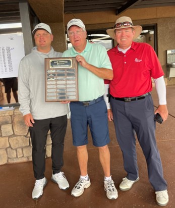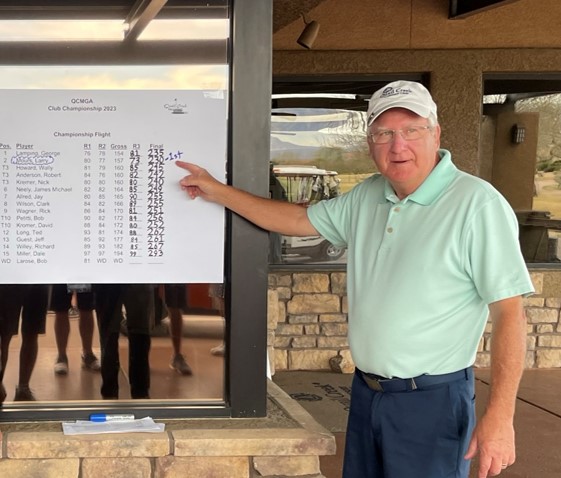 In the pictures below, Larry Mours is shown pointing at his winning final score in the QCMGA 2023 Club Championship. Also shown in the pictures is the presentation of the respective trophy plaques to Larry and George by Quail Creek Director of Golf Josh Wilks and QCMGA President Bill Sheppard.