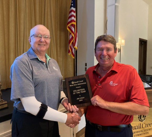 QCMGA member Jim Lynch (left) received the award plaque from QCMGA President Bill Sheppard (right) after being named QCMGA 2023 Volunteer of the Year during the QCMGA 2023 Annual Meeting held on Tuesday November 14th. Jim has been actively supporting QCMGA and the Quail Creek golfing community in multiple ways. His list of volunteer activities include: