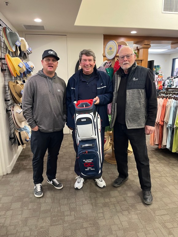 Shown in the picture are QC Director of Golf Josh Wilks (left) and incoming QCMGA President Bob Spetter (right) presenting a custom logo golf bag to outgoing QCMGA President Bill Sheppard (center) as a token of appreciation for his volunteer service in that position during the recent 2022-2024 time period. To fill out his remaining one-year term on the QCMGA Board of Directors Bill has graciously agreed to be the Tournament Chairman for 2025. Bill, thanks for all you have done for QCMGA.